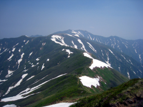 右奥に飯豊本山、正面種蒔山を越えれば本日の宿泊地、切合小屋です |
