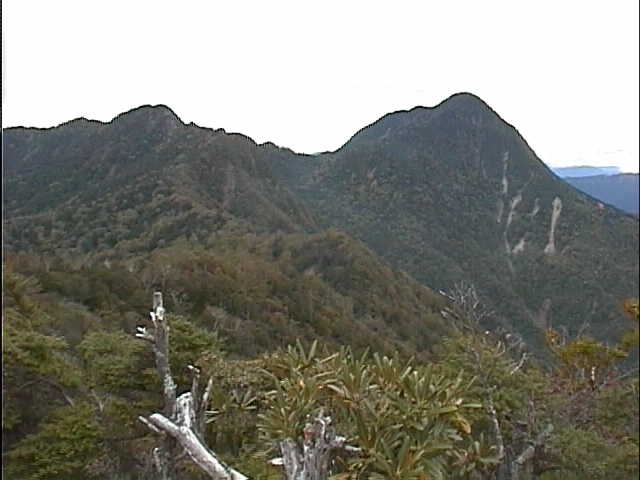 庚申山頂は林の只中で眺望はまったくなかったが、少し進むと前が開けた。目指す皇海山が目の前に、頂を半ば雲に覆われた姿を見せた。雲は空のすべてを厚く覆ってはいるが、その境界線は山並みまでは達していない。しかし、皇海山をはじめ、高い峰の山頂だけがその雲の底からはみ出したような片割れに纏いつかれている。昨日の天気が続いていれば...残念。少しでも山頂の雲が取れることを期待しつつ前進する。先は長い、まずは鋸山まで。そこまでが結構な難路であった。鎖場やはしごで上り下りを繰り返す。鋸山は山容は大きいが山頂はあっけないほどのもので、ただ通過する。ここから下って登ると皇海だが、この下りを引き返すと思うと気が重い。おまけに雨がぱらついてきた。