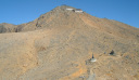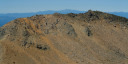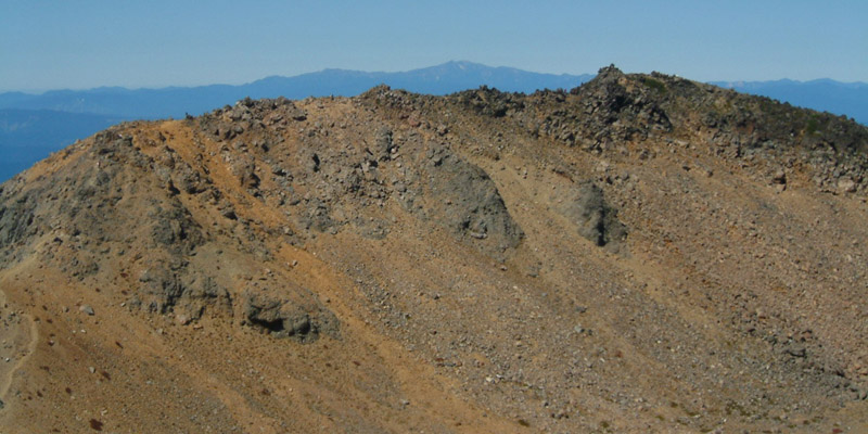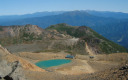 王滝山の小屋を過ぎたところは広々とした火山レキの鞍部になっている。何体もの大きな神体が建てられていて見事だ。高みに登ると槍穂高がはっきり見える。私の後ろを歩くツアーのガイドの話を盗み聞くと、この辺は高山植物がごく少ないそうだ。真夏の炎天下にこの山を登るのは大変そうだ。剣が峰山頂の手前にある50段ほどの階段が憎らしいほど辛かった。山頂は今日の人数では狭すぎてゆっくり休めそうもないので、岩場を少し降りたところに陣取り展望を楽しむ。山頂は、広い火口原を取り巻く一部でエメラルドグリーンの水をたたえる小さな池もあり、なかなかの景色である。展望は360℃のすごさで、南アの峰もほとんどすべて望める。北アもよく見えるが、下調べを怠ったので山座同定があまりできずに悩む。帰ってから調べてわかったのだが、立山と剣があんなに際立って見えるとは思わなかった。実に47座の百名山を指呼できるはずだった。先月登った伊吹山と荒島岳もはっきりとしない。浅間山があんなふうな形であんなところにあるとは思わなかった。昨日の焼岳と同じく、さすが著名な山はそれだけのことがある。すばらしい山であった。天気の良いときに何度でも登りたい山である。
