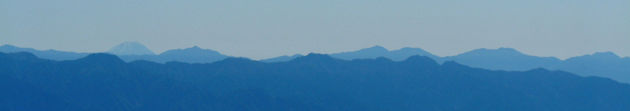 門をくぐると砂利道の広い参道がまっすぐに伸びている。しばらくすると傾斜もついてきて、調子に乗って早く歩いていると息が切れてくる。さすがに登山客は多く、追い越すことも追い越されることも頻繁で気を使う。樹林限界を過ぎて振り返ると、中アとその陰の南アがますます大きく見えてきて、富士山も姿を見せ始めた。北アはここからは陰になって見えない。登るほど登山客があふれてきて、30〜40人ものツアー集団もいる。登山道が岩の多いところになると脇のガレ場も歩けるようになり追い越しが割と楽になった。それにしても健脚の年配者が多い。健脚が自慢で追い越すのを楽しみに来ているようにも見える。私もこの年になるとその気持ちは良くわかる。ツアー組はえてして周りより遅いものだが、私も追いつかれないようにするのが精一杯というスピードで登っている。