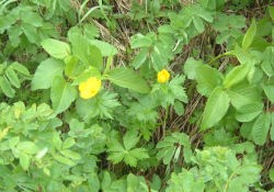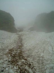 弥三吉の水までは長かったが、極楽平はあっという間に過ぎ、急登になる。銀冷水を過ぎると沢沿いになり雪渓がこのあたりまで残っている。まわりに満開のウコンウツギが群生している。すぐに雪渓の道となり、まだ硬いシュカブラなので滑りやすく歩きにくいうえに傾斜もきつい。軽アイゼンが必要だったかもしれない。泥土が寄せられ積もっているところがあり、割合滑りにくいので足跡はその上を進む。雪渓が終わって傾斜が緩むといきなり高山植物が現われてきた。 |