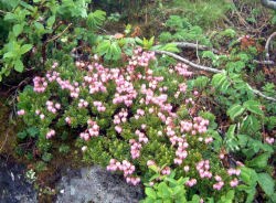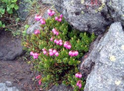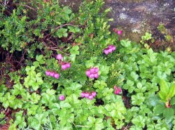 羅臼平に着いてもあたりはガスで真っ白く覆われて見えず、風が強い。本来ならばここで素晴らしい休憩となるところをすぐに山頂へ向かう。登る途中にも花がたくさんあり、展望が見えなくてもここまで来た価値は十分にある。イワヒゲ、イワウメ、チングルマ、エゾコザクラ、アオノツガザクラ、特にエゾツガザクラはびっくりするほど鮮やかに赤く、とても懐かしい。 |
