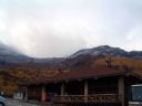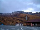 | 翌朝、まだ宿の人が起き出す前の薄暗闇の中を仙酔峡へと出発する。道はわかりやすかった。進むうち道路が曲がりくねって勾配が急になり、そろそろ着くと思っていたら白く大きな建造物が目の前に現れて驚いた。新興宗教系の仏舎のようだ。すぐに仙酔峡ロープウエー駅に着く。駐車場は広いが、車は他に1台だけである。車を出ると気温が低いようでヒヤッとする。予想以上に険しい様相の山肌がぐっと近づき迫力がある。曇天で稜線はガスに覆われ、なかなかすっきりと全貌を現さない。雪はついそこらあたりまで残っていて、稜線近くは真っ白に見えるが支障があるほど積もってはいないと思う。上のロープウエー駅が小さく見え、その下を登山道が続いているのがわかる。辺りはミヤマキリシマであろう、丸くまとまってかたまりになった小潅木が一面に密に点在する。ここ仙酔峡はこの花で有名なようだ。 | ||||