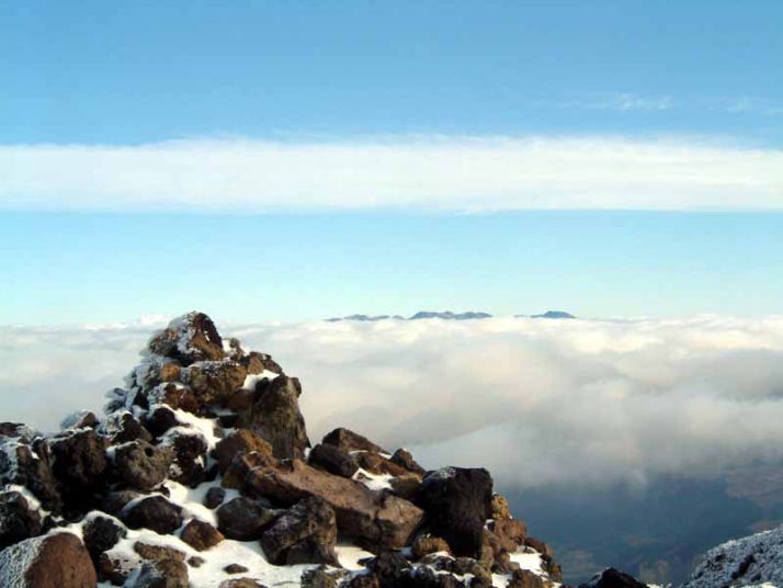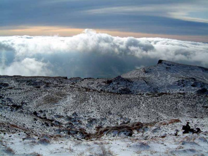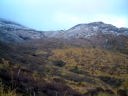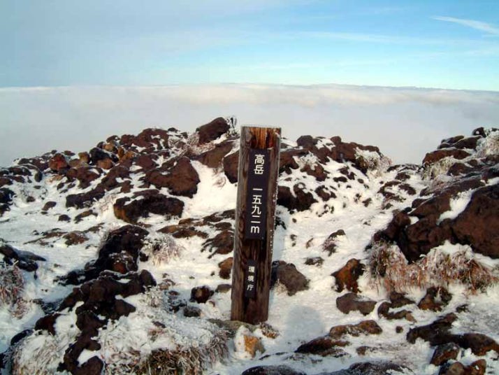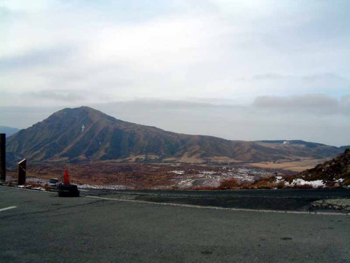 JASのウルトラ割引のチケットが取れたので1泊2日で九州へ行く。このチケットだと運賃が約1/3だから何とか出かけられるが、もう一般の航空運賃では馬鹿らしくて乗れない。熊本空港から予約したレンタカーで阿蘇へ向かう。行く手に外輪山の山並みを垣間見つつ、インターネットで予約した民宿を目指して走る。土曜日の夕刻なので国道57号線は熊本市内へ向かう反対車線が渋滞している。この国道が混むことは、以前祖母山に登ったときに地元の人に聞いたことがあった。明日は我が身だから、空港へ帰るルートはこの国道以外の道を探さなければと思う。阿蘇の広大な火口原を貫き大分へと通じている国道を進むと、いつしか外輪山の間を抜けて明日登る予定の高岳などが右に見えるようになる。山々はやはり冠雪をしていて、山全体の半分ほどにも白い部分が見え隠れしている。2日前日本列島を寒波が覆い、11月上旬としては稀な降雪が全国的に見られたようだ。九州にも降雪があったというニュースは聞いていたが、ここまで降っていたとは以外だった。ロングスパッツはもちろん持参したが軽アイゼンは“まさか”と思ったのでおいてきた。積雪はたいしたことはないだろうが、この寒さでは凍結するかもしれない。そんな心配をしているうち、山はもう夕闇に包まれ始め、シルエットとしてしか確認できなくなった。インターネットで、安いという条件で予約した宿は食べ放題の焼肉中心の食堂で、風呂などひどいものだったが、ひとりだからかえって落ち着いた。夕食も肉のお変わりするほどたっぷり食した。が