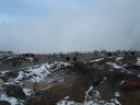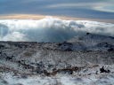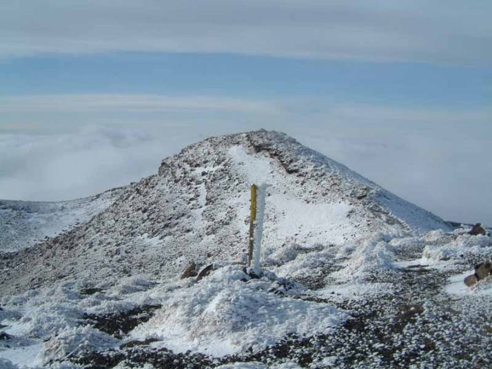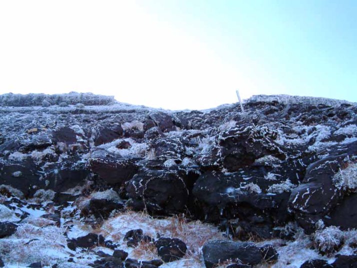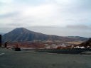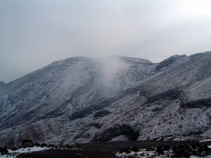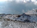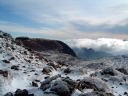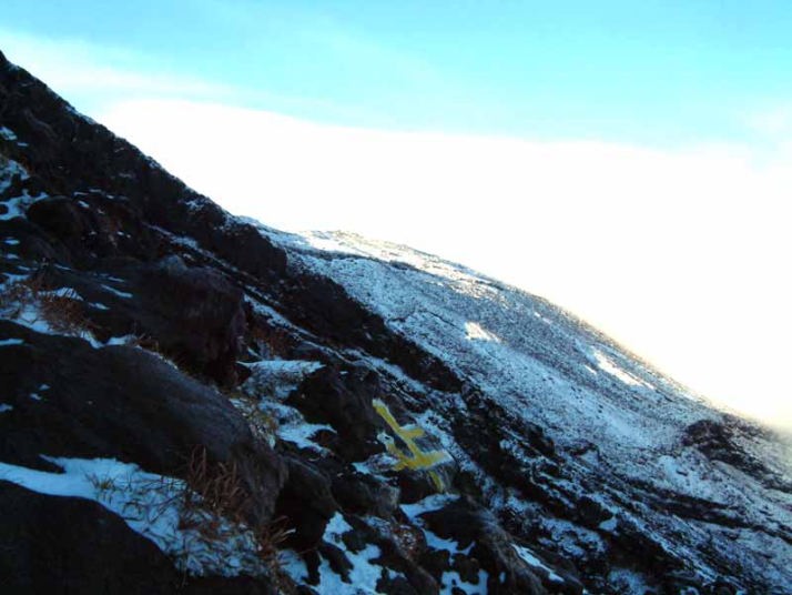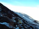 | 登りは向かって左側の尾根の道を行くことにする。特に上部がかなり急登に見える。小さな沢を越えて尾根に取り付くと、道はさすがに火山岩に敷き詰められ、火山礫だけの地面ではないので登りにくくはない。ところによって赤くなったり黒くなったり様変わりする。尾根は結構痩せていて、大きな岩がところどころにあるため、それを乗り越えたり巻いたりして行かねばならない。登るにつれて雪がだんだん多く残っているが歩きにくいほどではなく、凍ってもいない。下の駐車場でも気温は低かったが、尾根上は風がとても強く、体感温度は零下10℃を下回っているのではないかと思うほどだ。見下ろすとロープウエーの下の道はとても整備されているようで道幅も広く見える。こちらは普通の登山道で赤ペンキや木の杭が道標になっている。 | ||||