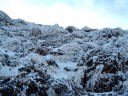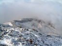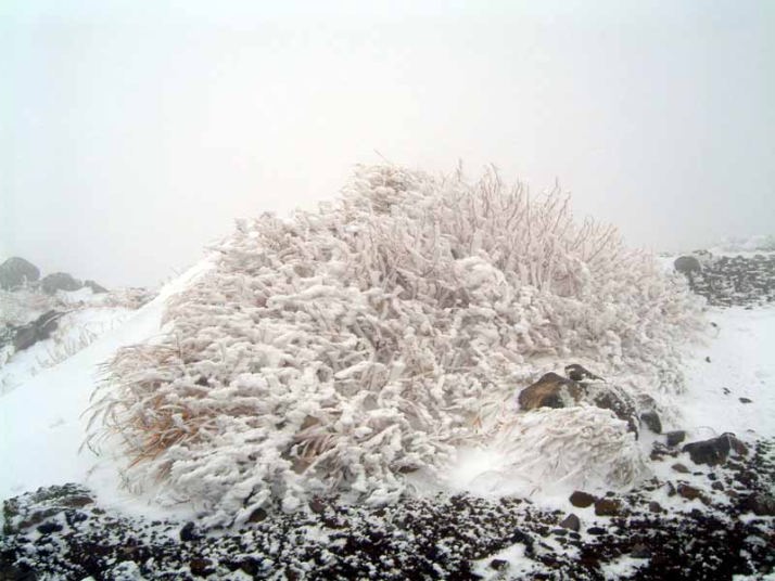 | 立ち止まって景色を見るくらいで休憩も取らずにゆっくりと登っていくと、勾配はますますきつくなるようだ。左手の稜線は虎ヶ峰、鷲ヶ峰と呼ばれ、ギザギザに鋭く切り立つ迫力のある岩稜が連続して高岳に向かっている。後で聞くと中部山岳に比してもロッククライミングでは有数の難場だそうである。歩いていて行く手の見通しが悪い場所では、まるでその岩稜に向かって進んでいるような印象を受けて不安になる。次第に雪のつき方が増え、潅木や岩に“えびのしっぽ”が付着して本当に冬景色になってくる。まさか阿蘇山でこんな経験をするなどは夢にも思わなかった。雪は吹き溜まりでも足首にも達しないほどなので歩行に支障はなく、空はどんよりと暗鬱ではあるが、岩と樹氷と濃霧が織り成す神秘的な美しい様相は滅多に体験しないものだ。大きな氷柱ができているところも何箇所かあった。稜線近くになると道の行く手が岩の壁に見えるところがあり、ちょっとびっくりするが、簡単に通過できる道筋がちゃんとある。 | ||||