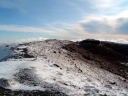 | ここからロープウエー駅までは巾が1間以上もある舗装された緩やかな道が続いている。雪が凍って滑りやすいところもあるが立派な観光道路である。ロープウエー駅に着いたが、ロープウエーの次便の待ち合わせ時間と下山時間を見合わせてロープウエーを利用することにした。舗装の道が下の駅まで続いているようだが路面が凍結していて時間がかかりそうだった。ロープウエーで上から見ると、登りに使った尾根の道がずっと見渡せ、かなり険しい急斜面を登ったことがわかる。ロープウエー駅に写真があるのを見てもミヤマキリシマの時期はさぞかしすごい景観なのだろう。 | ||||