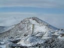 | 稜線に出ると反対側は20mほど下が平坦な火口原になっていて、その一角に避難小屋も見える。展望はあいにく雲が上がっていて九重山くらいしか望めないが、実にすばらしい景色ではある。稜線はなだらかであるきやすく、少し進むと高岳山頂だった。写真を撮ってすぐに歩き始める。風が強いこともあるが、実は5日前から禁煙を志している最中で、腰を下ろすとタバコを思い出すし手持ち無沙汰なので、休まないでゆっくり歩くことにしている。それに荷物も軽いしきつい山でもない。 | ||||