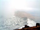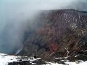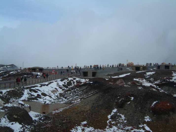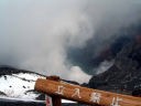 | 高岳から50〜60mも下るともうガスの中に入ってしまう。雄大な風景であろう火口群が見えず残念だ。あいかわらず一人として出会わぬまま稜線をぐるりとロープウエーの方へ辿る。頑丈な防護柵がずいぶんと長く据え付けられている場所へ着く。ここがロープウエー駅から訪れる火口展望台になっているようだ。ここに至ってやっと三々五々登ってくる人々が現れるが、ほとんどが観光客のようである。 | ||||