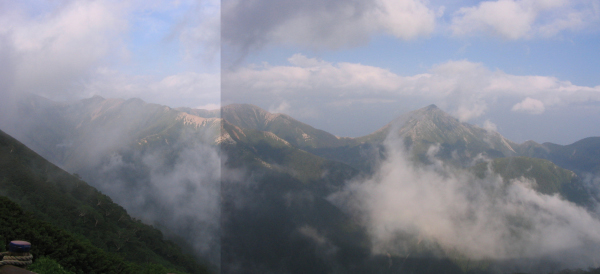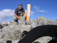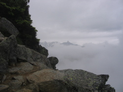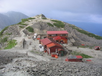●雨が止まず、カッパの下も履いて赤沢山に向かう。下り口が不鮮明でちょっとうろうろするが、確かに踏みあとが付いていた。とんでもない急降下で、黄色いテープが所々に着いているだけだ。どうしても岩の斜面をトラバースしなければならないところに行き止まった。黄色いテープに書いてある小さな矢印は確かにそこを渡れと言う意味だろう。でもステップがないので、頭の上にある枝をつかんで「エイ、ヤッ!」と渡りきる。ヒヤヒヤものである。かなり下っての登りはハイマツ等の藪が下に向かってかかっているので、力任せで登る。登りあがるとほとんど平らな広い尾根で、山頂の三角点と標識のある場所まではすぐだった。しかし、カメラを忘れてきたことに気づきがっかり!帰りは2座目登頂の安堵から10分ほども休憩したが、それを除くとほんとに1時間ちょっとで往復することができた。小屋はやはり満員状態だったががそれほど窮屈でもなかった。