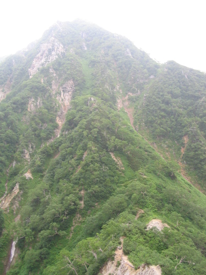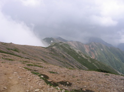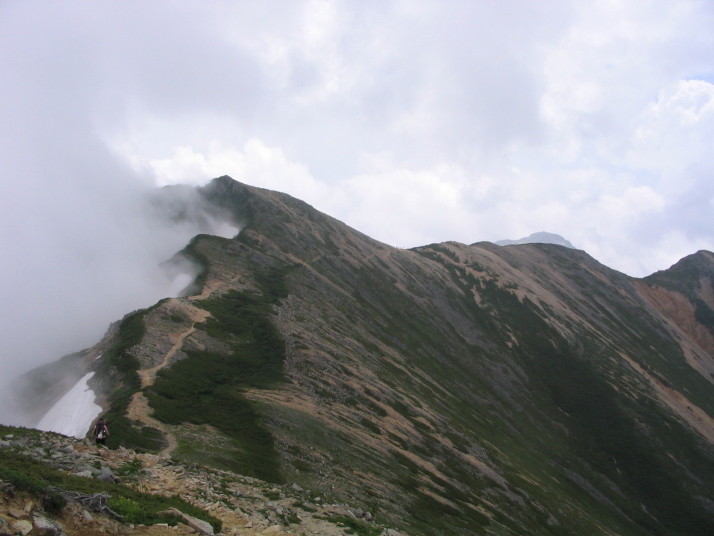 ●槍の穂は省略して、雨は降らないものの相変わらず雲の中にいるようで景色のつまらない道をひたすら西岳へ急ぐ。銀座コースだからすれ違う人も多いが、ヒヤッとする場所も少なからずあって、歩きにくい道が続く。赤沢山は台地形のなだらかな山容だがヒュッテとの間の切れ込みは大キレットの如くに自分には思える。ヒュッテへの道を仰ぎ見るとかなり急峻で、あの沢筋のどこを渡るのか不安にもなる。途中で雨になった。