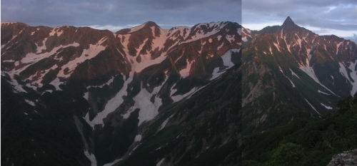 ヒュッテ西岳から、左から東大天井岳、横通岳、そして常念岳の雄姿 |