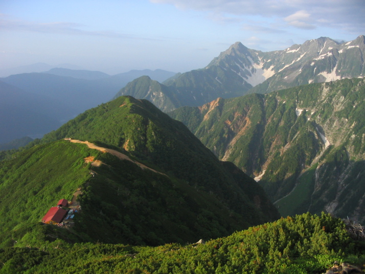 ヒュッテ大槍が霞んで見える ここは女性好みのいい小屋らしい |