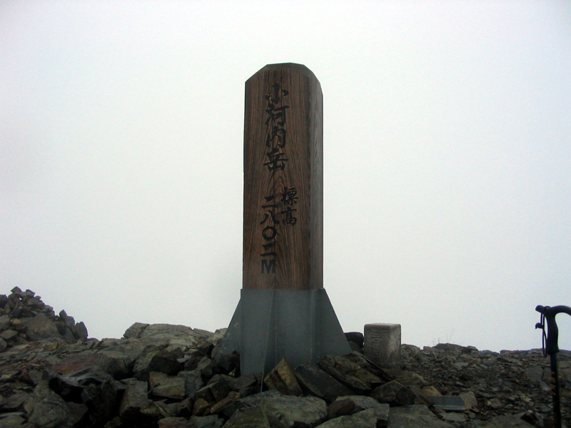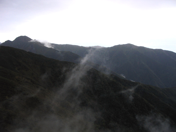 天気が思わしくない。一昨日の天気予報では晴れマークも出ていたのに、朝から雨である。OB会の仕事を放り出してまで来たから何とか好転しないかと願う。ここ4週、崩れそうな天気を回復させてきた晴れ男の力もこれまでのようだ。このコースは初めてで、カーナビの入力違いから釜沢の林道終点まで行ってしまい、1時間近くのロスタイムとなった。こんな天気でも駐車場には7〜8台の車、バスまで駐車していた。ほとんどが塩見目当てだろう。鳥倉林道終点から合羽を下だけ履いて傘をさして林道を歩く。稜線に取り付いてから巻き道となっているが、私の持っている地図は稜線上にある。昭文社の地図も古いものなので少しずつ違っていた。荷物が普段より重いので三伏峠までが長かった。傘は烏帽子岳手前までは有効だったが、それ以降は風が強くてやめた。登り始めが遅かったからすれ違う人が数人だけで烏帽子岳からは誰にも会わない。静かな山歩きと言いたいところだが、すっかり雲の中で何も見えず、稜線に出ると風雨が強く、気が滅入る。でも半分は風下の巻き道だから助かる。目の前の山塊を越えるとまた次が見えるという具合で、目標がまったく見えず、ただ黙々と歩くだけだ。それでも独標2784(前小河内岳)に着くとほっとする。あと30分はあると思い休憩したが、歩き始めてすぐにガスの中に小屋らしきものが見えてやれやれだった。小河内岳で写真を撮って、すぐそばの避難小屋に入る。まだ新しくきれいな小屋だが、冬季の準備のため窓が釘付けになっており暗い。誰もいないが、これから誰か来るのを待つ気持ちと来ないのを願う気持ちと半々だ。朝から握り飯2個だけだったから、ピラフを作ってビールを飲む。小屋の中でも10度以下になっていて寒い。4時前になって「まさか」と思って小屋を出ると、素晴らしい景色が広がっていた。富士山から荒川岳、赤石も聖も見える。振り返ると今日来た稜線がずっと見えてその向こうに塩見、その左に甲斐駒から仙丈、その左、ずっと奥には槍穂から後立山が全部見えていた。しかもうれしいことに塩見岳と蝙蝠岳の間に、あと数日で行くことになる白根山嶺の一部が、おそらく白河内岳、広河内岳が見えている。1時間前からすると奇跡的な神がかりな情景だった。これで今日のすべてが報われる。