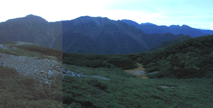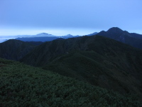 左に塩見、右に蝙蝠 真ん中に白根南嶺 |