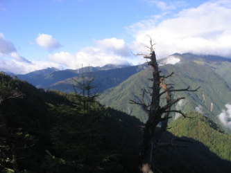 静岡駅で天野・市川両先輩と待ち合わせ、天野先輩の車で畑薙ダムへ向かう。平日だからであろうが、広い駐車場には十数台ほどの車しかなかった。ダム手前の決壊していた道路の工事がほぼ終了していて通行でき、東海フォレストの送迎車のバス停はすぐ近くにあった。時間があったので共同装備の分配をする。バスには10人ほどだったが、椹島ロッジで乗り換えると、二軒小屋へ向かうのは我々3人だけだった。下山時に宿泊予定のロッジに着替え等を預かってもらい、本日の幕営場所である転付峠へ登り始める。市川先輩(隊長)がトップ、私(平隊員)、天野先輩(リーダー)の順である。とても歩きやすい道で、古道を偲ばせる雰囲気がいい。2時間で稜線に出ると、まさに林道跡がある。トイレもあり、それほど汚いものではない。幕営の準備にかかって一人用のテントがないことに気づく。バス停に置き忘れたか、二軒ロッジに預けた荷物の中か、誰が忘れたのかわからない。仕方がないので多少窮屈だが3人用のテントに3人寝ることにし、シートとフライは絶好の荷物置場となる。新倉方面へ5分ほど下って水を汲んでくる。天気は曇り、明日の好天を願ってテントに入る。夜中に少し雨が降った。