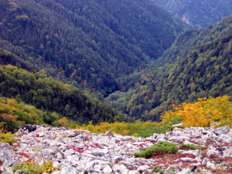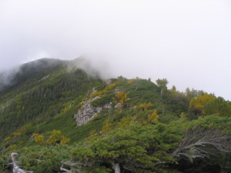 笹山北峰からは視界が開け、岩が多くなって高山の様相となる。同時にウラシマツツジなどの草紅葉が見事である。山肌はまだほんのり程度で、本格的な黄葉までは2〜3週間はかかりそうだ。独標2813は白河内岳というが、広河内岳と混同して話がかみ合いにくいので自然と「ハクコウチ」と呼ぶようになった。そのハクコウチは踏み跡が大きく山頂を巻いていたが、山頂を踏むか踏まぬかで2対1の多数決で省略。大籠岳はいくつもあるピークのどれかを確かめながら着いた。東側を見れば地形で簡単にわかったのだが、百高山だから踏み損ねたらえらいことだと慌ててしまった。「ハクコウチ」を過ぎたあたりで天野先輩がこちらへ向かう登山者を発見したが残りの二人には見えないので、賭けになったが、休憩中に単独行者が本当に現れて大笑い。広河内岳がすぐ目の前に大きい。その後ろの濃鳥岳はもっと大きい。今回の目標である3座の百高山の最後の展望はすばらしいものだった。ここで今回のコース最後のふたり目の登山者を山頂に迎えて池の沢に下る。黄ペンキやケルン、青テープを確認しながら踏み跡を辿る。池の沢池は静謐で神秘なところであった。釣り人が魚を焼いた跡があり、ひとりきりでなければキャンプにはもってこいの場所だ。ここからのルートファインディングはきついものがあった。倒木や崩れているところが随所にあって踏み跡がたびたび寸断されている。それでも何とか明るく余裕のある時間に出合いに着いた。小屋はじめじめと汚いので幕営にする。