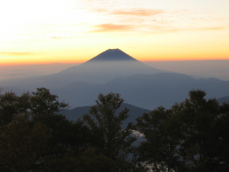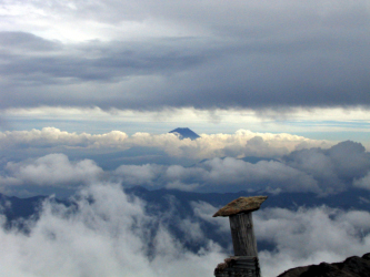 朝食をとって水を汲みに行くと、素晴らしい富士山が迎えてくれた。この地点からはとても大きく見え、翌日、笹山辺りから見た富士はかなり遠く小ぶりに見えた。奈良田越までは林道歩きである。林道とはいっても既に廃道になって久しく、崩壊してガレ場になっているところもあるし、道いっぱいに生えたシラビソやツゲの若木がもう背丈の倍ほどになっているものまである。しかし古街道という雰囲気が満ち満ちていて味わいがある山歩きだ。奈良田越で林道を離れ、作業小屋跡裏から山道となる。ずっと樹林帯で、踏跡はしっかりしているが、覆いかぶさる枝を掻き分けて、ところどころにある赤布(赤テープ)を見つけながら進むことが多くなる。樹林帯を抜けたところが何箇所かあって展望台となる。天気は上々で、歩き始めには徳右衛門岳くらいしか見えなかったが、歩き進むうちに千枚岳や塩見岳、蝙蝠岳も大きくみえるようになった。この時期の2,000m以上だから気温もひんやりと程よく、暑いと藪が多いので難儀をするだろうが、あまり汗をかくこともない。藪を払いながら踏跡を辿る単調な歩きを続けて、今回の目標三山のひとつ、笹山南峰に着く。広くなだらかな山頂が樹林に囲まれていていいサイトになっている。念のため北峰までサイトを見に行くが、景色はいいが風が出てくると問題なのでここに決める。案の定、その夜はすごい風の音であった。