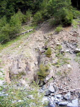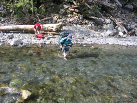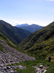 今日は余裕があると予想したから、幕営地を8時に出発。2万5千図を頼りに林道跡を進もうと、まず1回目の渡渉。水は痛いほど冷たい。林道らしき跡を辿るが川の淵で進めず、また渡渉。林道跡に戻ろうと3回目の渡渉をして、地図の橋のあるところに来るが橋はない。橋があったであろう残骸はあるのだが、その先の道らしきものが全くない。結局また渡渉して河原沿いに進むと、その先に地図にないはずのところに橋が見えた。しかし河原沿いに進むのはかなり危険で、50mほど高巻いて橋に出る。結局、渡渉の度に浅瀬を探したり、山靴を脱いだり、マネージをしたりで、かなりの時間を食ってしまった。その後も林道が崩れてガレをトラバースするところが何箇所あったか忘れるほどあり、二軒小屋ロッジへ着いたのはちょうど5時であった。このコースは登りに使っていればコースが見つかったと思うが、出合から池の沢池までが問題となる。