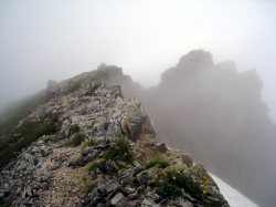 この日は朝からずっと濃いガスで視界が極端に悪く、山容がまったく見えなかったので、地図と磁石だけが頼りだった。頂上小屋の人に聞いたら南側の巻き道(←)を廻って南西の尾根筋を登ったほうがいいと言われたので、その通りに巻き道を目指す。しかしガスが濃く、おまけに雪田で道が途切れ、南側の巻き道を確認できないまま、巻き道の上部にいると思って斜面をトラバースした。結局、巻き道の少し下をトラバースしていて、ほとんど尾根筋近くの登る途中で巻き道に出会った。 南西の尾根筋は踏み跡もところどころにあり、岩と低いハイマツで登るのにそれほど苦労はなかった。下山時に南東の尾根に明瞭な道があるのがわかったのでそれを進む。ほとんど途切れのない道で、雪田上部(↓)にとっつく。ガスで周りが見えないので軽アイゼンをつけたが、それほど急ではない。方向を確かめながら下るとほどなく雪田を越えて登山道に出た。ガスさえなければもっと楽に登れた。 |