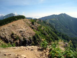 手前の道のように稜線が狭く 油断ならないところも多い |