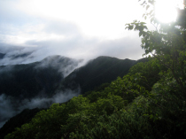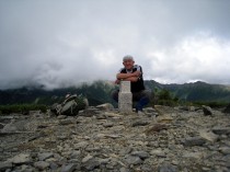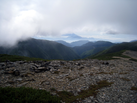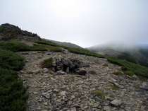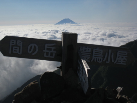 昨晩は寒い中をがまんして日本酒をしっかり飲んだので、夜中に何度も目を覚ましながらもたっぷりと睡眠がとれ、体の疲れもかなり回復したようだ。これまで通り暗いうちに小屋を出ると、雲海の上に富士や団十郎のシルエットが浮かんでいる。荒天を思わせるのでカッパの上下を着用してカイデンを点けて出発する。小太郎の分岐近くまで来ると、ガスで隠れながらも素晴らしいご来光をおがめた。やはり山は早出に限る。小太郎は、分岐に着く前に稜線を見通せたが、ピストンに入ってからは霧雨交じりの強風で先の見通しもきかず寒かった。想像していたよりも岩嶺の稜線が多く時間がかかる。潅木帯に入るとハイマツ等の枝がうるさくかぶり、うっとおしい。濃霧の中にうっすらと見えるピークに何度もだまされながらも、山梨百名山の道標が立つ小太郎山に到着。広河原への下りはいつも通り長く苦しいのを覚悟していたが、体調が良かったのか、順調にあっさりと下りきってしまった。