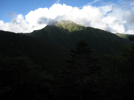 朝弁を注文していたので、翌日はカイデンを点けて暗い道を塩見岳へと進む。小雨交じりの深いガスだが本谷山に着くまでに塩見のシルエットが見えるほどに晴れてきた。