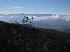| 荒船山 内山峠の広い駐車場に着くと、登山道入口に通行禁止の看板があった。台風禍で2箇所道が崩れているとのこと。他に車がないから先行者がいないらしく、迷ったが、いまさら他の登山口に廻るのも時間がかかりすぎるので、押して行ってみることにした。下りの途中まで誰にも合わない静かな山で、駐車場に着くと擦れ違った人の車が3台増えていた。 | ||