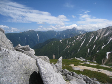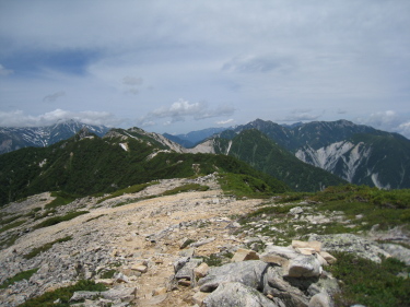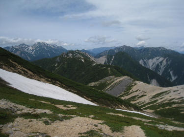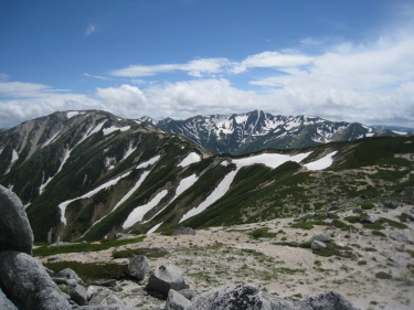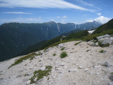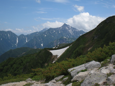 振り返って、烏帽子の向こうに立山や針ノ木 |