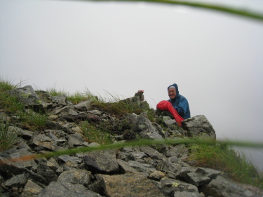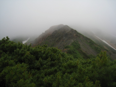 雷は収まったが雨は止まず、合羽着用の1日であった。竹村新道は野口五郎小屋で前日下ったパトロールの人からの情報で問題ないということであった。踏み後不明確なところがあるかと思ったが、心配無用だった。ずっと雨に降られていると、冷たさはまるで感じないものの、ゴアテックスの合羽でも下のズボンはびしょびしょである。寒いので着ていた上着も内側から吸い込む体から発散する湿気で重く濡れていたがさすがに暖かかった。下着はまだサラサラ感が残っている。トムラウシ・美瑛の大量遭難が風雨のための低体温症とのことだが、条件が悪くなることを考えると他人事ではない気がした。