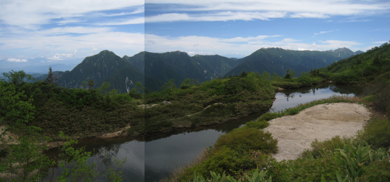 烏帽子天幕場付近の池、餓鬼岳から燕・大天井の銀座コース稜線。 |