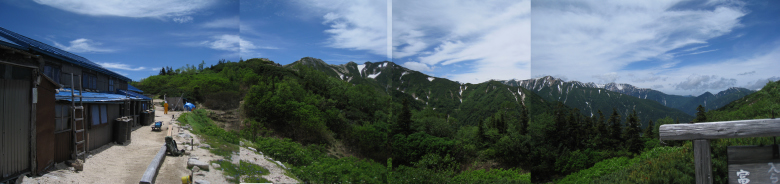 烏帽子小屋から180度近くのパノラマ 烏帽子小屋に着いたときは雲は多めだが天気が良かった。目指す赤牛岳もくっきりと確認できた。 |