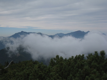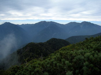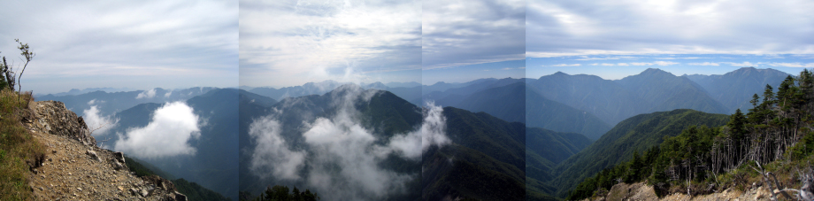 テントを張ると、身軽になった体に力が残っている気がした。まだ1時半、バテても、何とかして4時までには帰れるだろう。ザックの中身をほとんどテントに入れて出発する。すぐに後悔の2文字が頭に浮かんだ。垣間見た笊と小笊が遠く高く大きい。150m下った鞍部まで長く感じたが20分で通過する。登りの200mがやはりきつい。山頂のすぐ下にテントが張ってあり、その脇を枝に引っかかりながら通るときに「すみません、もう誰も来ないかと思ったもので」と女性の声、日帰り氏が「元気なおばちゃん」と言っていた人だろう。顔はテントの中で拝見できなかったが、声で50〜60歳と踏む。山中女性一人なので話しかけても悪いかと思い、どういうコースを歩くのかとも訊かなかった。笊ヶ岳の展望はさすがに大パノラマ、素晴らしかった。ただ、くっきりと鮮明には見えない。塩見、北岳、鳳凰あたりは雲に見え隠れ状態だ。アーベントロートはさぞや、と思うも引き返す。ザックにストックがあったので使ってみる。かなり足への負担が減った。これでテントまでの長い道のりを乗り切ることができた。明日も使用することを決めた。