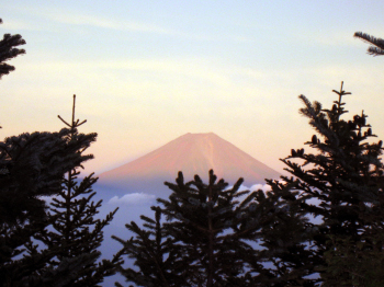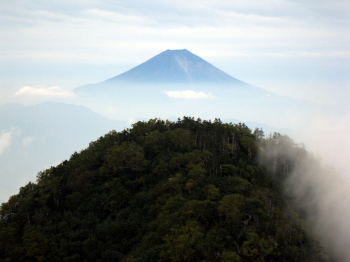 夜中、何度も目を覚ましたが、風の轟音は相変わらず。テントはほとんど揺れないので不安は無かった。結局10時間は眠っただろうか。5時頃富士山を見ると、まだ雲もかぶらずくっきりと見えていた。インスタント味噌汁に昨日の残りのにぎり飯を入れて簡単おじや。絶品!と言うこともない普通の味。6時に出発し、ストックを使って下り始める。これでかなり足の負担減になったようだ。登りの単独行者と出会う。昨日は桧横手山に泊ったそうだ。桧横手山まで1時間、次の1本で700m近く稼ぐ。途中でひとりに追い越される。大きい荷物なので、どこから来たかと訪ねると、笊ヶ岳に直接登る北隣の尾根を老平から昨日登って降りて来たと言う。どのくらいの藪なのか、藪が好きだと言う。まだ30歳そこそこだろうが、すごい人もいるもんだと思う。私も学生時代にやってはいたが。登りの中高年者何人かと擦れ違う。老平を4時前に出て日帰りと言う。見れば明らかにオーバー60の夫婦もそのようだ。すごいの一言。ちょっと心配。