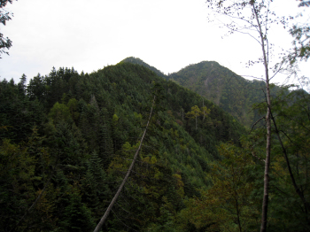 鞍部付近から見る笊と右に小笊 笊ヶ岳は手前の山に隠れそうになっている |