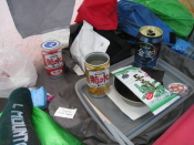 やっとこさ、サイトに着いて足のストレッチをしてから、テントの中で頭で描き続けた祝杯。入口から富士山を眺められる位置にテントを張った。至福のとき。これはピストンでは味わえない。富士山は2〜3合目から上には一点の雲もない。