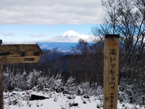 当初は樽峠から貫ヶ岳も一緒にやるはずだったが、自分の力ではプラス4時間は無理があると判断し、翌日に最短コースで登ることにした。高ドッキョウ山頂で会った若い人が貫ヶ岳に行ってくるというのを聞いて羨ましいと思った。素晴らしい天気の上、高ドッキョウ山頂は富士山側の樹木が伐採されていて絶景であった。私以外に3組と出会った。