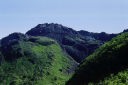 稜線の道を少し進んで、行者岳付近から小屋へ向かう道を探すとその道が無い。おかしいと思って引き返すと大きな岩のすきまに通行禁止の立て札が立っているところがあって、どうやらそこがコースの入口らしい。崖の上から覗くと中腹をへつるような細い道が見え、初心者には危険なので通行止めになったのだろう。七高山手前から新山へ続く道は、100m程も急に下ってから御室への道へ登り返していて、ここに着くまでに体力をかなり消耗していたので見るだけでうんざりする。単独行氏が下りの途中で道をそれ、雪渓を経て新山への道に入る短縮ルートを取りはじめたのが見えたので、良くないとは思いながらも誘惑に勝てず自分も続いた。疲れた体にはこの近道は精神的にも助かった。山頂へは累積した大岩の上をよじ登るようにして高度を稼ぐ。こういう道はずーっと私の好みであったが、年のせいか疲れのせいかひょいひょいとは登れず、ちょっと悲しい。山頂には先着者が一人しかいなかった。東北の人で、「この鳥海山には積雪期に来るのがやっぱりいい、雪があった方が登りやすいし」と言う。雪山の経験がほとんど無い私にはうらやましい。晴れ上がって雲が上がる前の展望は素晴らしく、北は森吉山の向こうに白神山まで見えると教えてもらった。頂上は狭く、すぐに団体が大挙押し寄せてきて賑やかになった。彼らが下りにかかる前に立ち去ろうと思ったが、チャンスを逸して最後尾をのろのろ付いて行き、岩場で別ルートをとって追い越すと「急行さん」と揶揄された。