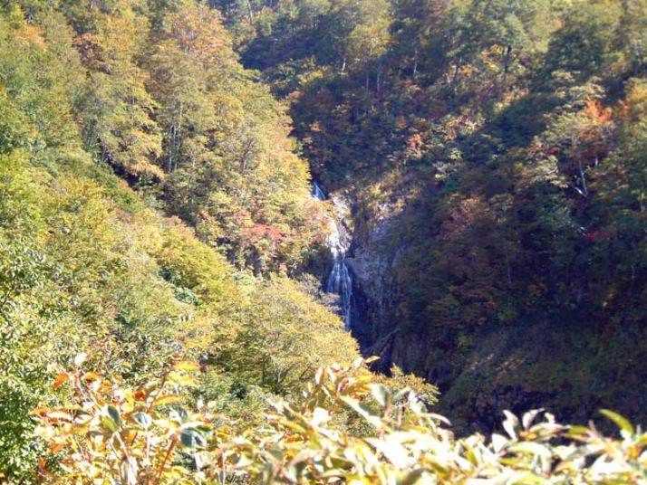 尾根に取り付き、だらだらの道を進むと地図上標高892mの独標に着く。一気に視界が開け、大岳と守門岳が堂々と並んでいる。四等三角点があり、四等の割に立派な柱石の測量標がある。ほぼ平坦に続く道をさらに行くと標高1000m地点と書かれた大きな看板もありオカバミ滝という滝見台になっているようだ。谷を見ると確かに滝が見える。遠くて小さくしか見えないが周辺の景色とあいまって絵になる美しい滝である。ここからすぐのところでいきなり急登となる。登り口に「長く苦しい登りです」と書いてある。確かに1時間半ほどの辛抱の登りであった。樹木の丈がだんだん低くなり、右側が開けたところに出ると、色づいた山肌が間近に望める。まもなく大岳の分岐点に着く。北側の山並みが望め、飯豊と思われる稜線が遥かにあり、その手前越後の山々はよく知らないので同定できない。