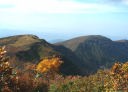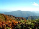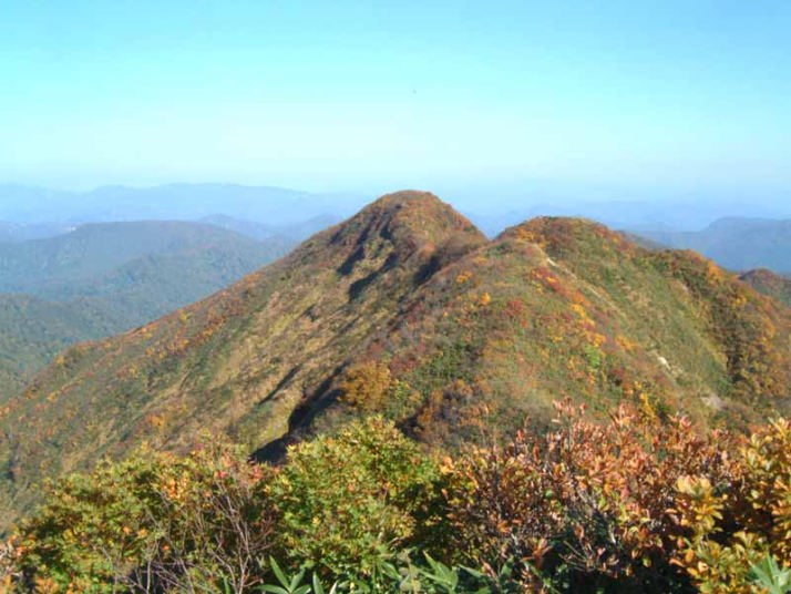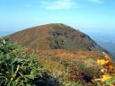 連休に仲間と越後駒と八海山をやるので、その先乗りをし、前から気になっていた守門岳をやっつけることにした。大宮から新幹線で長岡へ。駅から少し歩いたところにあるジャパレンでレンタカーを借り、守門岳へ向かう。道路は標識を三条市方面から守門方面へと辿って行けば迷うこともなかった。二口登山口への入口を通り過ぎてしまったがロスはそれほどなく、ほぼ予定通りに二口登山口駐車場へ着く。意外にたくさんの車が止まっていて驚く。地元には親しまれている山の一つなのであろうし、紅葉の盛期でもある。見上げれば谷の向こうになだらかな稜線が見えていて、茶褐色に色づいている。守門のピークなのかどうかは見当が付かない。もう10時半を過ぎていて最も遅い出発であるらしく他に登山客は見えない。登山カードを提出して道を右へ取り5分も行かないうちに山道に入る。