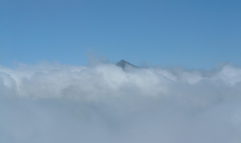 間もなく行く手のガスが晴れて、あたりの様子が突然目の前に広がった。山肌はむき出しの大きな岩と緑とのコントラストに幽玄な趣があり、見上げると意外に近く赤茶けた頂上付近が見え、一部から噴煙が上がっているのがわかる。高山特有の岩と草の急斜面が続き、上まで点々と散らばる登山客の着衣のカラフルさが際立つ。しかしまわりの峰々の展望は相変わらず雲が厚く高く覆っている。そのはるか上空は青空が広く見えているのに...。その雲の壁を横目でちらちらと見ながら急斜面を登っていると、雲のはるか高い部分が切れて黒いものがわずかに覗いた。それだけ高い雲の向こうは空だと思っていたが想像以上に山が近いようだ。方向からすると霞ヶ岳らしい。これから展望が開けるとのではという期待感で最後の急な登りを踏ん張る。次第に硫黄の臭いが鼻を突くようになる。稜線に登りきると見事な火口原が開け、その北側に巨岩に囲まれた大きな竪穴が見えるが、どのくらい深いのかは頂上からでもついにわからなかった。結局2時間半程度で北峰に立つことができた。旧道を3時間以上かけるつもりだったので儲けた気分。360℃の展望ができるはずの山頂からは、雲の壁と青空しかみえない、と思ったら笠ヶ岳と抜戸岳の頂上がぽっかり浮かんでいた。そのうち奥穂高山頂と思われる黒い峰が一瞬垣間見えた。西に白山らしき山脈も一瞬覗いた。しかし、ここまでであった。1時間ほど粘っては見たが回復に向かう気配がないし、明日の御岳登山のためのキャンプ場探しもあり、再来を期してあきらめて下山する。