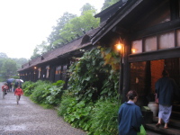 初日の宿泊先は有名な乳頭温泉郷・鶴の湯温泉、送迎バスを降りたとたんに、みんな大感激です。本陣として由緒もある茅葺き屋根の佇まい、時代劇のセットのようです。泉質の異なるいくつもの風呂、大きな混浴露天風呂、もてなしも含めて、温泉ランキングで上位を保っているのが納得できます。若い女性客も意外に多くて、オヤジ連の期待はいやが応にも膨らみましたが、やはり空振りでした(泣)。