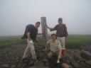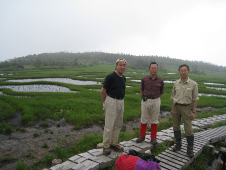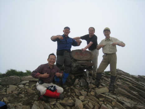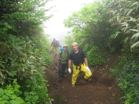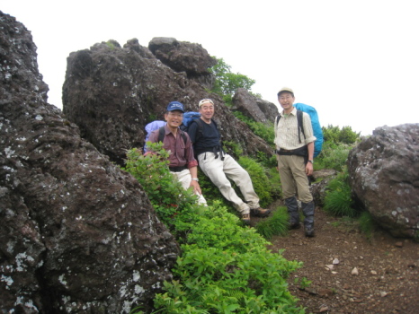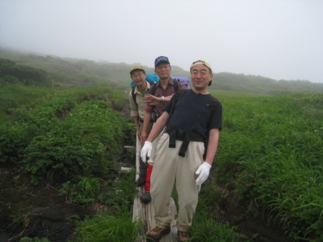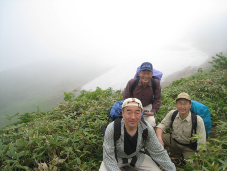 二日目は八合目から乳頭山への縦走です。好天を期待するも、雨こそ降りませんでしたが、すぐ周りの山さえ、ほんの一瞬(数秒&ぼんやり)しか見えませんでした。それに大雨の後だけに路は滑りやすく、高島は何度も尻から転倒してみんなの笑いを誘い、私も負けずに大転倒してケガナシ。それでも花はどこまでも路傍に溢れています。雪渓が残っていて水芭蕉も咲いています。クニオ曰く「この水芭蕉は天然だ!」(何のこっちゃ!)。千沼ヶ原での食事は気分最高でした。宿でもらったおにぎり完食のうえ、カップラーメンはうまいねー!で、オヤジ食い過ぎ(苦)。おかげで次の1本のきついこと!乳頭山はその名前から(男なら当然)想像したのと違い、山頂付近が岩場になっていて、ちょっとびっくり。途中、簡単に追い越された白人のハイティーンカップルに写真を撮ってもらいます。クニオのノリで、乳頭山だけに「よろちくびー!」の掛け声とジェスチャー入り。それを見て受けていた、やたらと明るい白人カップルにも強制的に「よろちくびー!」をやらせて写真を撮ってあげました(爆)。可愛い女の子の方は大笑いしながらも頬を染めていたので、多少は意味がわかっていたのでしょう。