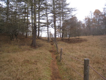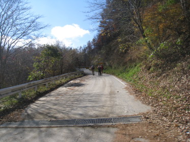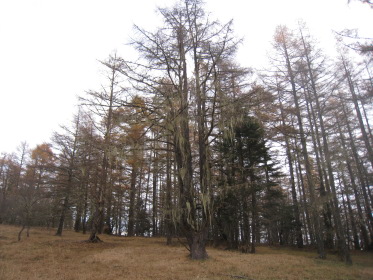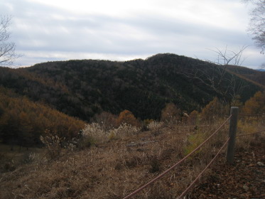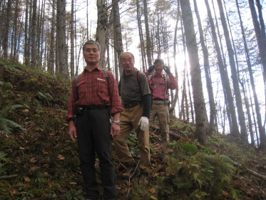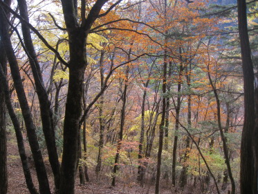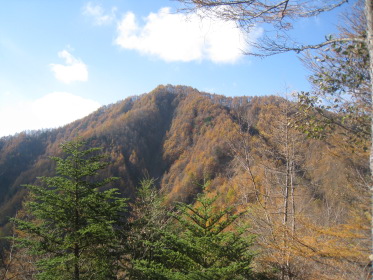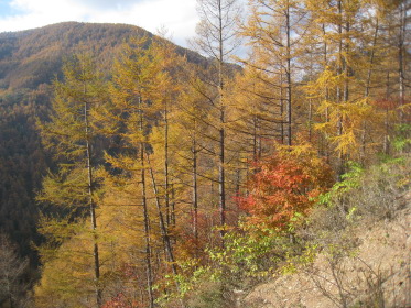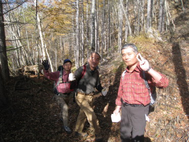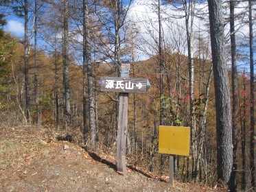 すぐそばの林道ゲートには鍵がかかっている。工事車両の運転手がいちいち鍵を外して通っていく。そのゲートの脇を通って源氏山に向かう。峠の近くに沼があって畔に茶屋があった跡らしき空き地がある。「峠の駐車スペースにテントを張って泊れば櫛形山は簡単に登れるな。」「水は林道脇の側溝を流れるものを使うか?」「やっぱりこの水じゃな〜!」「予定通りキャンプ場に行こう!」と語りつつ林道を進むと、源氏山に向かう林道にもゲートがあって、谷が開けて見晴らしが良く「いい景色だなー」「結構色づいてるじゃないか」とか言いながら右側の展望を見ながら進む。リーダー「あれっ!登山道がないな?」クニオ「さっき左の道脇に源氏山って書いてあったよ」みんな「早く言えよっ!」ということで引き返すと、やはり標識があった。こんな大きな標識を見逃すとは!みんな「気が付いたのに何で言わなかったんだよ」クニオ「だって俺はリーダーに付いて行くだけだから」??。「まあいいか」と登山道を進むが林道とずっと並行していて、「林道行った方が早かったんじゃないの?」「気分が違うよ」「やっぱ山に来たら、山道だろ〜」。しばらくすると『あぶないから、はいってはいけません』という看板があった。正しく素直なワンダラーたちはその看板を怪しむことなく林道沿いの山道をそのまま歩き続ける。リーダーが気付いた。「あれっ!『はいってはいけません』を入れってネットに確か書いてあったな」他のみんな「もう、遅いって!」と、いまさら引き返すな空気が出てそのまま進む。これが結果的には良かったかも。林道沿いにクネクネと山裾沿いに軽い上り下りの道を行くと、やがて鞍部に着く。やっと目指す源氏山がお目見え。こんもりした小さなピークだ。ここからしばらく下って登り返す。源氏山の山頂は平らで樹林の中、展望は全くない。それでも山梨百名山たる所以はどこかにあるのだろう。陽気な我々ワンダラーはめげずに昼飯を食って帰途に向かう。リーダーは鞍部からは尾根の道を行くと決めていた。道が目の前のピークを、来た道の反対側を巻いて続いている。小さな鞍部に着くと道は東に向かっている。しかし帰る方向の西のピーク側には道はない。ハラダの磁石を見るとなぜか西を指している。「あれっ、こっちか?」リーダーは?のままその道を行く。「もう一度磁石を出してくれ」やはり西を指す。コウヘイが自分の磁石を出して、「こっちは東だよ」なんとハラダの磁石は何故か大きく狂っていた!「変な磁石だね〜」と言いつつ戻って西側の道なき急斜面を登る。リーダーが踏跡を発見、稜線に出る。ここから南に尾根が続くがはっきりした道はない。踏跡程度だが尾根歩きなので間違いようがない。ほとんど歩かれていない道だが、藪などないから正統ワンダラーには何の不安もない。かつて道だった跡がある踏み跡をどんどん進み、あの『あぶないから、はいってはいけません』の看板のところを乗り越える。途中で降りる道があったので林道に出る。「なんだ、林道のほうがいいじゃないか!」登り始めはあれほど山道がいいと言っていたのに...。それにしても山梨百名山なのに、出発してから車に戻るまで、今日は他の登山者にひとりも会わなかった。きっと明日の櫛形山では、あの駐車場にあった車の数からすればたくさん会うだろう。あまりきつくない行程に気分良く車に戻ってキャンプ場を目指す。