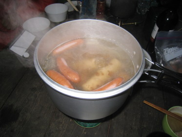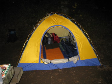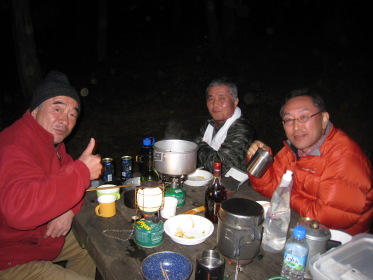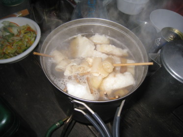 キャンプサイトはファミリーキャンプ場らしく設備は揃っているが一張りも張ってないし管理人もいない。「この季節じゃね」さっそく買ったばかりの我々の共同テントを張る。ゴアテックス、本格山岳用テント、4〜5人用だが、みんなは「これじゃ3人だな〜」。購入した張本人、しかも保管者のリーダーは一人用のテントでひとり寝だ。すぐにおでんの用意。出発前にあれこれモミにモンだ献立。結局レトルト。リーダーが用意した牛筋等の本格オデンも用意する。「うまい、うまい」の声とともに酒盛りが始まる。やがて終演、テントにもぐりこむ。クニオは寒くてなかなか寝れなかったと翌朝愚痴ったが、リーダーはホカホカでぐっすり、とはついに言えなかった。