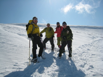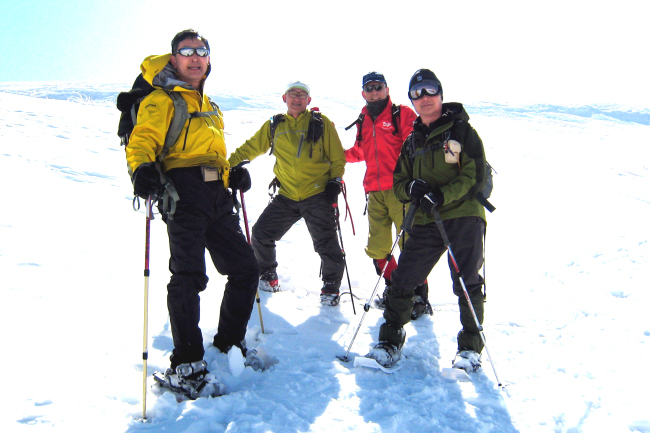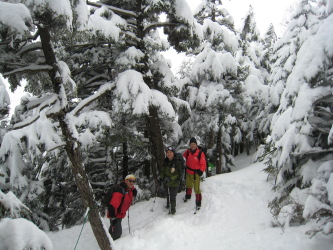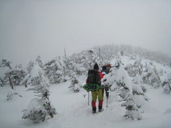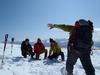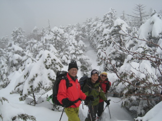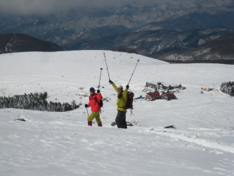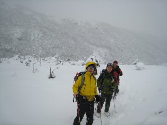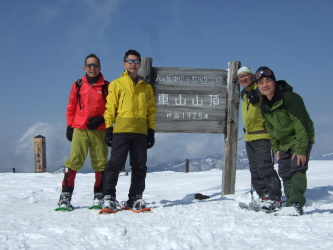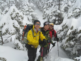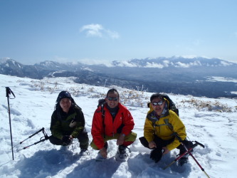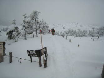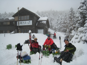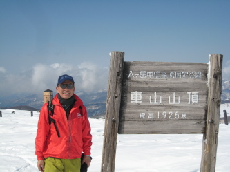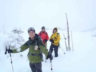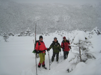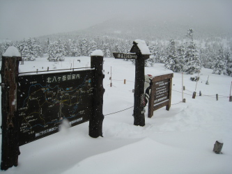 平成24年3月10日朝6時、中央線豊田駅にて小田野、島、少し遅れて小川が原田車にザックを押し込み、正月の飲み会以来の再会の挨拶を済ませ、中央高速諏訪を目指し出発した。今回はこの4人である。心配していた空模様はいつの間にか雪に変わり、タイヤチェック渋滞はあったが、車内は和やかに時間が過ぎた。車は諏訪から雪景色の茅野を通り、その奥に広がる別荘地を抜けピラタス横岳ロープウェイ麓駅に到着した。7〜8分で約500mを稼ぐ百人乗ロープウェイにスキー客に交じり、2220mの山頂駅まで一気に登った。小田野以外は1年振りの軽アイゼン装着であるが、今回Mが居ないこともあり、スムーズな装着で全員準備万端である。何故か身体の硬いMがなつかしかった。十一時半、ストックを調整してゆっくりと出発。雪は降るが風弱く、思ったより暖かく緩やか。坪庭の登りで厚着の小川は汗をかいていた。原田もおニューのジャケットが頗る防寒良く、これまたシャツを脱ぐほどであったが、小田野と高島は調節が出来ていた。手軽なコースと言うこともあり、様々な格好の登山者とすれ違うが、基本的な装備を忘れているグループもあったようだ。暫く南に縞枯山を見て、北にコースを変え重い雪で枝を下げたシラビソの樹林帯を進む。出発から一時間を要し北横岳ヒュッテに到着する。早速、小屋の前で空腹を満たし、三十分で三角点のある横岳南峰を通過し、すぐに同北峰山頂(2480m)に到着する。あいにくの雪で景色はなく、休息の後、登頂の証拠写真を撮り山頂駅まで一気に下山した。本日の予定はこれで終了。今日の宿泊は、小田野の友人が営むゲストハウス「コロモデ」である。とてもアットホームで料理が美味しかった。翌日は朝食を済ませ、オーナー夫妻の手厚い見送りをいただき、車山肩まで車を進める。既に先陣がおり、僅かなスペースに車を止め、スノーシューを付けて車山山頂を目指す。山を大きく巻きながらゆっくりと登り、頂上手前で絶景に小休止。風はややあるが快晴であり、昨日登った横岳、左隣にどっしりした蓼科山、右に八ヶ岳連山、山間から富士山も覗き満足する景色である。そこから十五分程で気象レーダーのある山頂(1925m)に到着した。反対斜面からリフトで登ってきたスキーヤーが景色に見とれていた。我々は風を避け、塔の陰でお湯を沸かし各人が軽食と一服を取った。出発直前、小川に塔に付いた雪が落ちたが「大丈夫か?」の声もなく各自、黙々と準備をしている、素晴らしい仲間達である。下山の途中、コースを外れ膝上辺りまでの新雪をラッセルしながら、走り下るが如く、時に奇声をあげて楽しく山を下りた。今回が三回目のスノーシューWであったが、下りに関しては一番楽しかったかもしれない。「次の予定はどうする?」と車中の話し合いをしながら早めの帰路となる。 高島昇