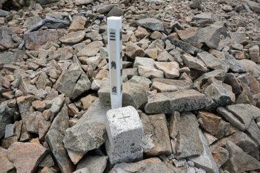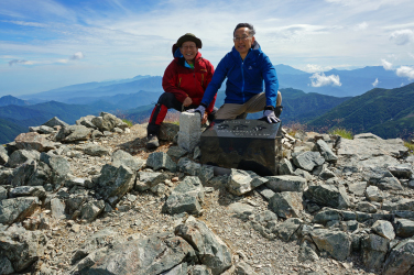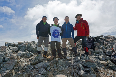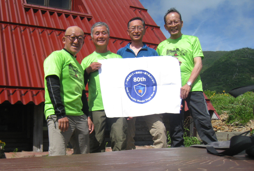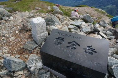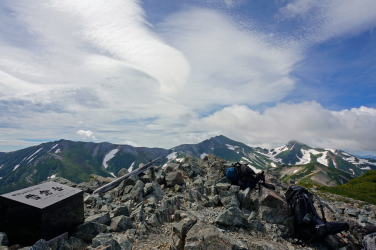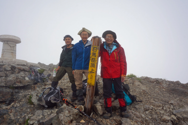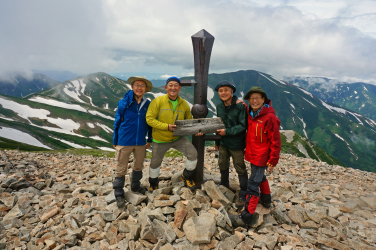 雪倉岳山頂(2日目) 風が強くて80年旗がひろげられない |