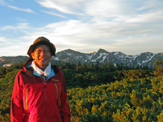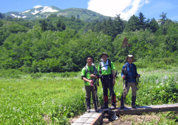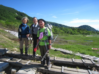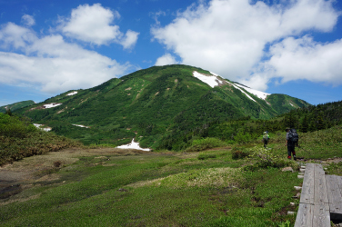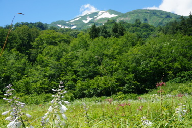 オオギボウシが咲く湿原の向こうは朝日岳 |