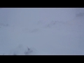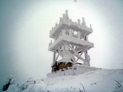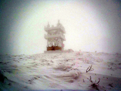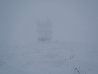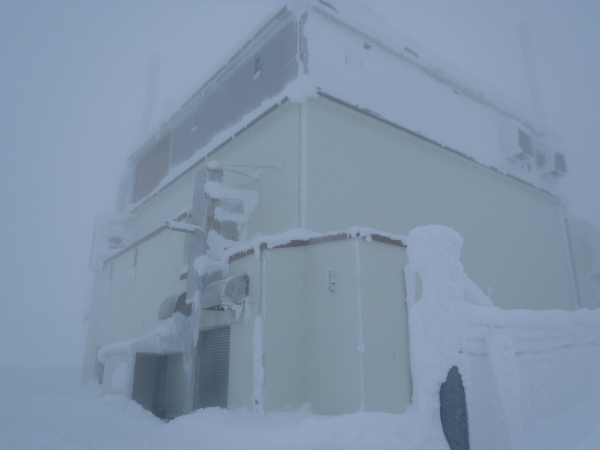 山頂付近に近づき、森が途切れると稜線は雪交じりのすごい風です。トレースは吹き飛び、ガスで視界も悪いので方向を確かめながら進みます。かなり寒いので氷点下20℃くらいにはなっているでしょう。体感温度はかなりの劇寒状態です。山頂手前の電波塔は20〜30m手前になるまで見えませんでした。でもここからは道路があり、紅白縞のポールが山頂方向に延びて立っています。雪が飛ばされて路面がむき出しの個所もあります。ポールのせいで方向に不安はないものの、この天気で山頂に行ってもなー、と弱気になるほどの風雪と視界の悪さです。道路は山頂だと思われる小高い部分をほぼ一回りするように廻り込んでいます。すぐ上に山頂の建物が見えるはずなのにぼんやりとも見えません。直登しようとしたらすごいクラストでスキーがくるぶしまで埋まってしまいます。これじゃ帰りも滑ることはできないと思いつつ、やっと建物の前に着きました。ここまで予定をはるかに上回る2時間もかかってしまいました。建物入口前がきれいに除雪されていて何日か前に係の人が建物内に入ったことが分かります。寒いので一服してすぐに帰途につきましょう。