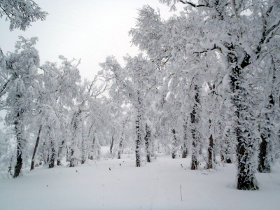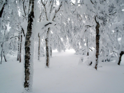 天気は昨日から悪天に変わり、今日は雪交じりの曇天で、あまり楽しくないツアーになりそう。雪はなかなかのパウダー、くるぶしくらいだからラッセルの労なし、ほぼ平面なのでステップのまま歩きましたが、どうせ付ける羽目になると思ってシールを貼ります。山頂への標高差は200mくらいでほとんど平坦な森の中です。1箇所だけジグを切る斜面があって、ここは帰りに3、4ターンくらいできるかと期待します。トレースは山スキーの往復らしく、緩い斜面に逆ハの字がついているのでわかります。こういうダラダラのコースはシールの脱着の判断が難しく、やはりステップは便利ですね。そのトレースも途切れる箇所があるけれど、GPSと地図と磁石で確実に現在地を把握できます。平坦な森の中ということは方向を間違えれば修正にかなりの労力を使う羽目になるから慎重に、何度も現在地を確認します。